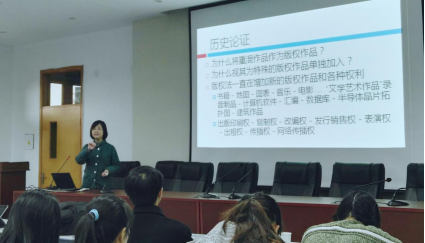 讲座中,李教授首先以“重混”概念为切入口,通过举例形象具体地说明了什么是“重混”,进而详细地阐述了“重混”的特点,指出重混作品是借用其它作品创作出的具有新的主题和形式的创新作品,不同于汇编作品和改编作品。李教授认为重混创作有着很大的经济价值,它代表着一种新的文化,反映了社会和经济现实。