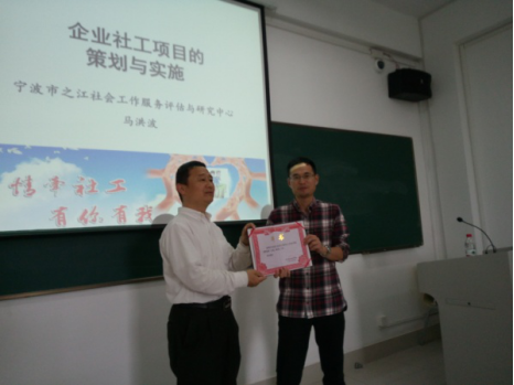 2017年5月9日,bat365官方官网社会工作系邀请了宁波市之江社会工作服务评估与研究中心主任马洪波来到《企业社会工作》课堂,围绕企业社工项目的策划与实施为社工系学生开展了一次别开生面的讲座。在讲课前,社工系主任陈建胜副教授为马洪波颁发了bat365官方官网实务导师荣誉证书。